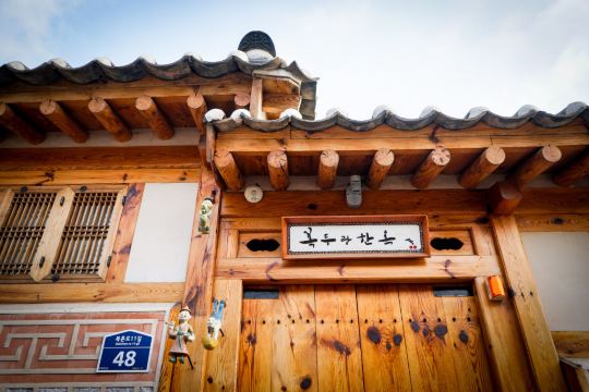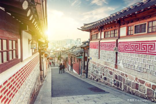 1. **Traditional Hanok**: Bukchon Hanok Village is a famous traditional Korean house settlement that preserves the architectural style from the Joseon Dynasty. Most houses here are built with wood and clay, featuring unique traditional Korean roof designs and structures.