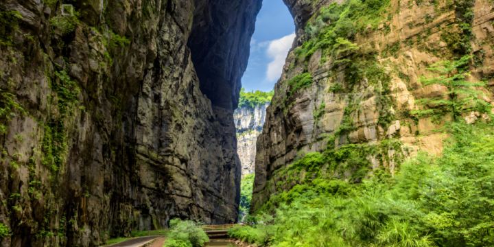 ▲ The Three Natural Bridges scenic area is known for its three natural stone arch bridges: Tianlong Bridge, Qinglong Bridge, and Black Dragon Bridge, forming a cluster of natural bridges. These bridges are majestic, unique, perilous, beautiful, secluded, and extraordinary, having withstood tens of millions of years of natural forces. At the bottom of the Tianlong Bridge pit in the Three Natural Bridges lies the ancient-style Tianfu Posthouse, with its blue tiles and gray walls. Originally built in the second year of Tang Wude (619 AD), it was a crucial post station between "Zuantianpu" and "Baiguopu," serving as an important relay for official information between Fuzhou and Qianzhou in ancient times, before being destroyed by war. This building is located in the Wulong sinkhole, beneath the Qinglong Bridge of the Three Natural Bridges. A valley road, approximately 5 meters wide, runs along the bottom of the pit, resembling an ancient post road suitable for wooden carts and horseback riding. The posthouse is situated beside this road, with its roof overshadowed by Tianlong Bridge.
