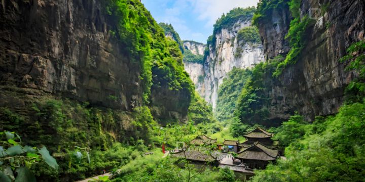 ▲ The Tianfu Posthouse is an ancient post station ruin located at the bottom of the Tianlong Bridge pit in Chongqing's Three Natural Bridges. It was originally built in the second year of Wude in the Tang Dynasty (619 AD) as an official posthouse for transmitting documents and receiving officials between Fuzhou and Qianzhou during the Tang Dynasty, but was later destroyed by war. The existing buildings were rebuilt in 2005 for the filming of "Curse of the Golden Flower," based on historical records, as a replica Han-Tang style courtyard. It includes over 20 blue-tiled, gray-walled houses, stables, and post roads. The roof is covered by the Tianlong Bridge rock wall, and it is surrounded by karst landforms.