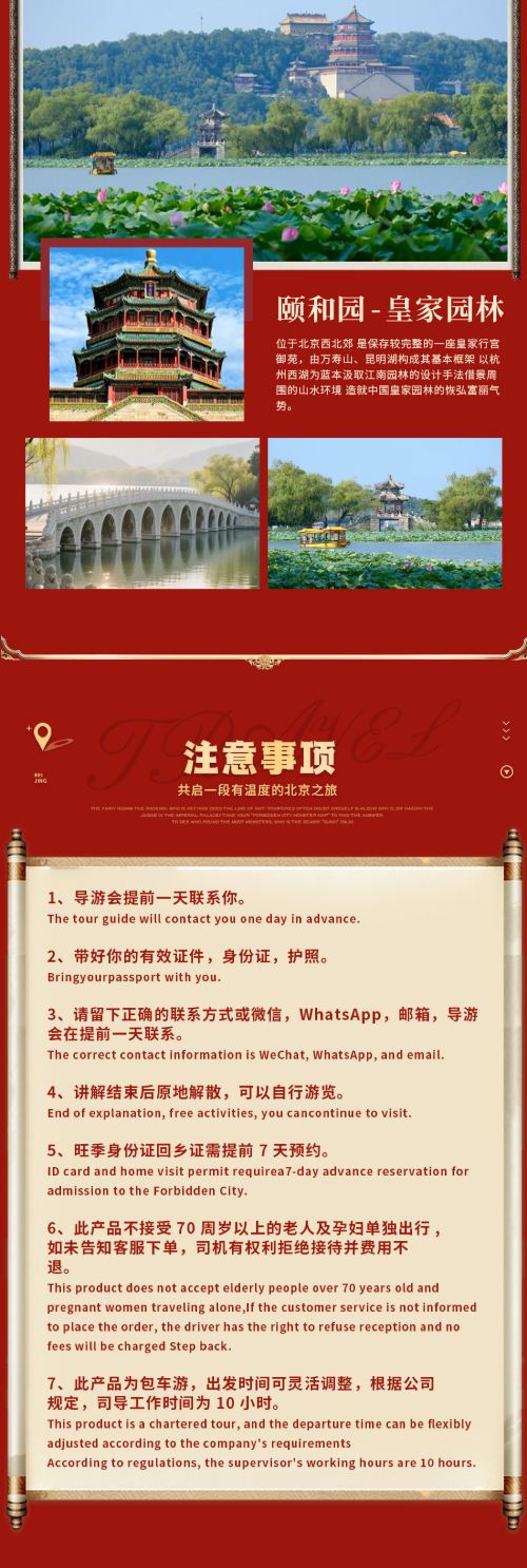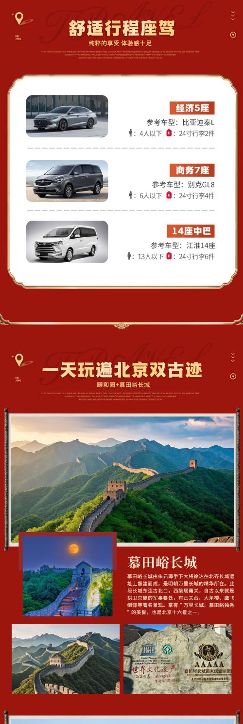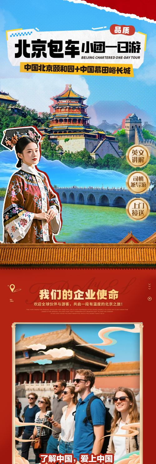 Chartered car service to Mutianyu Great Wall and Summer Palace in Beijing, with Chinese and English-speaking driver, including entrance tickets and pick-up and drop-off within the Fifth Ring Road.