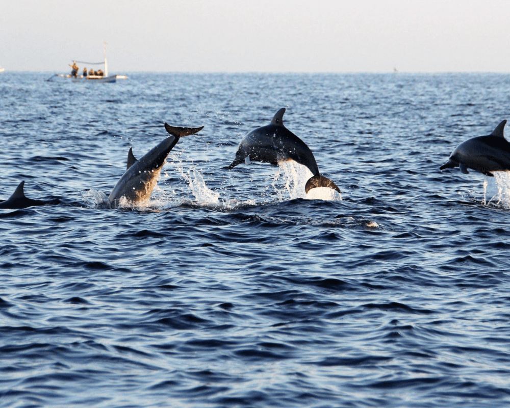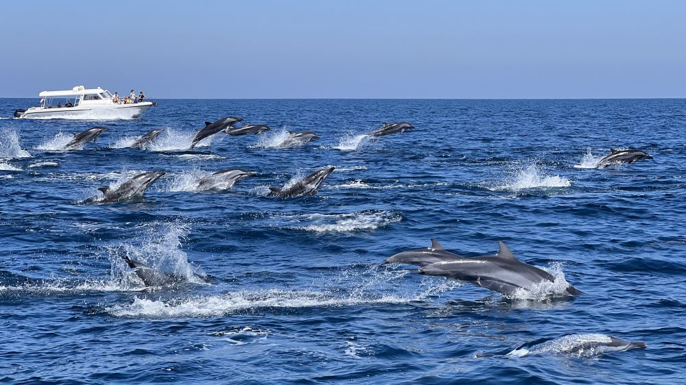 The dolphins in the Gulf of Oman are completely wild and naturally inhabit these waters, with a 90% chance of spotting them. The ancient Greeks considered the sight of dolphins around a ship to be a good omen.