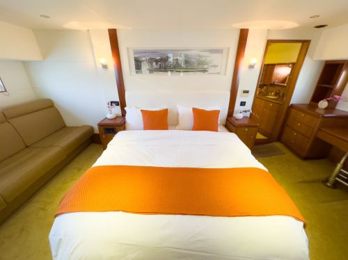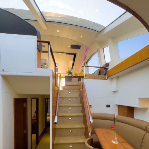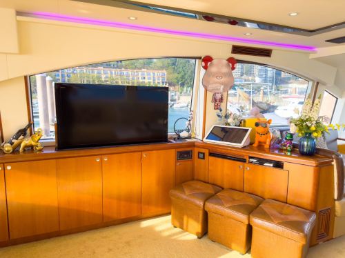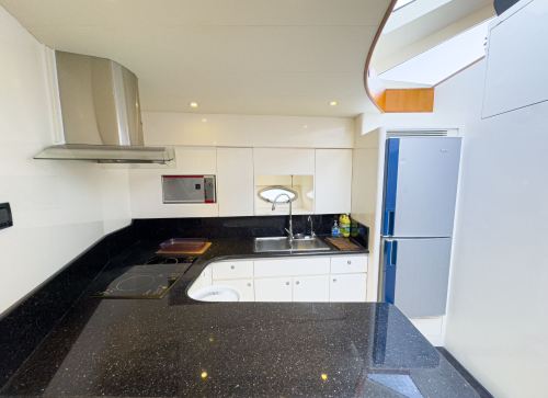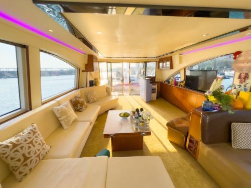 Yacht facilities: Three decks with living room, bedroom, sofa, kitchen, bathroom, KTV & game room, and 360-degree flybridge viewing platform