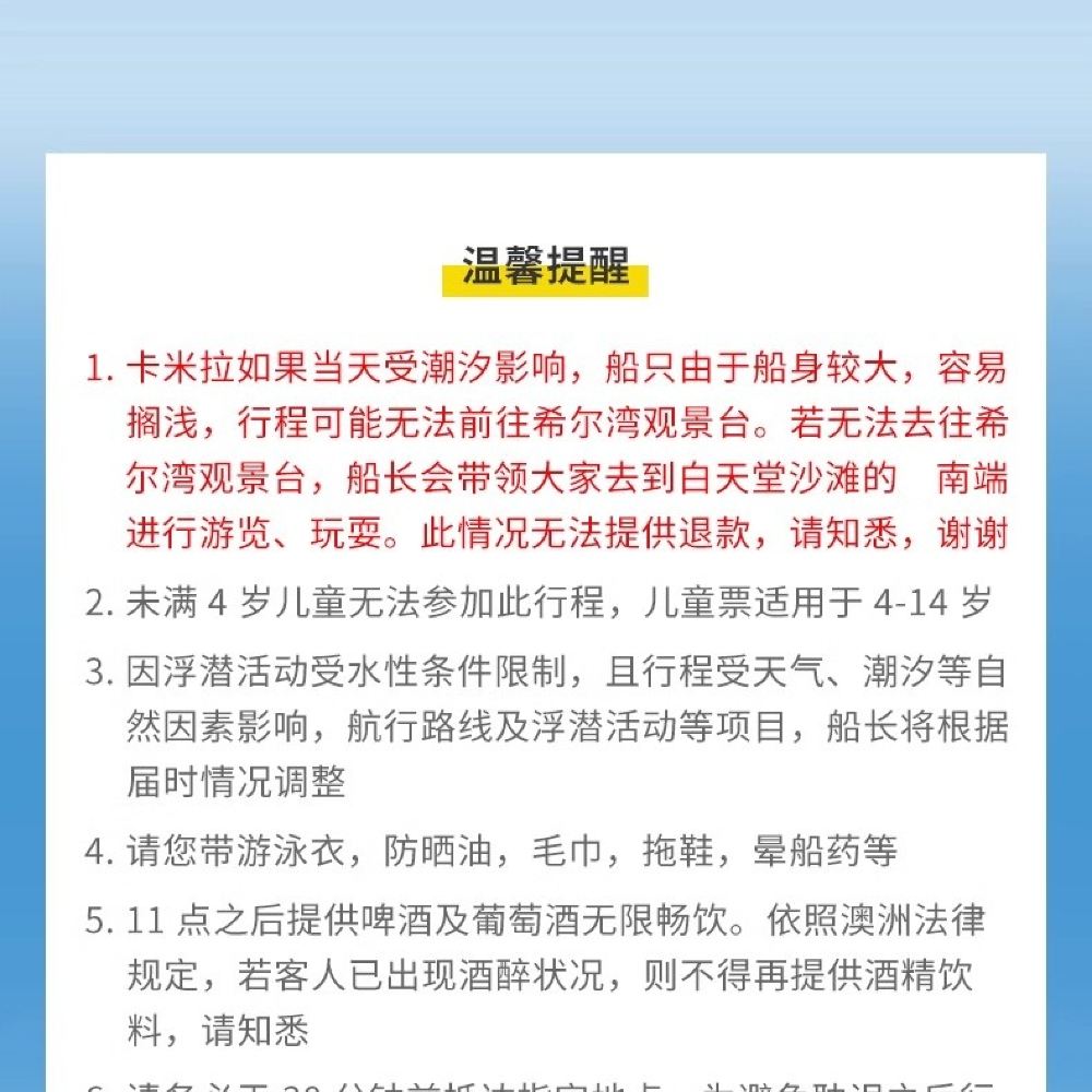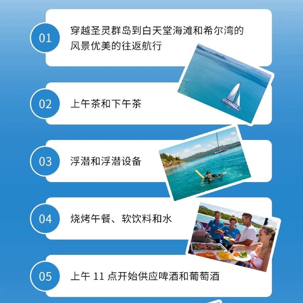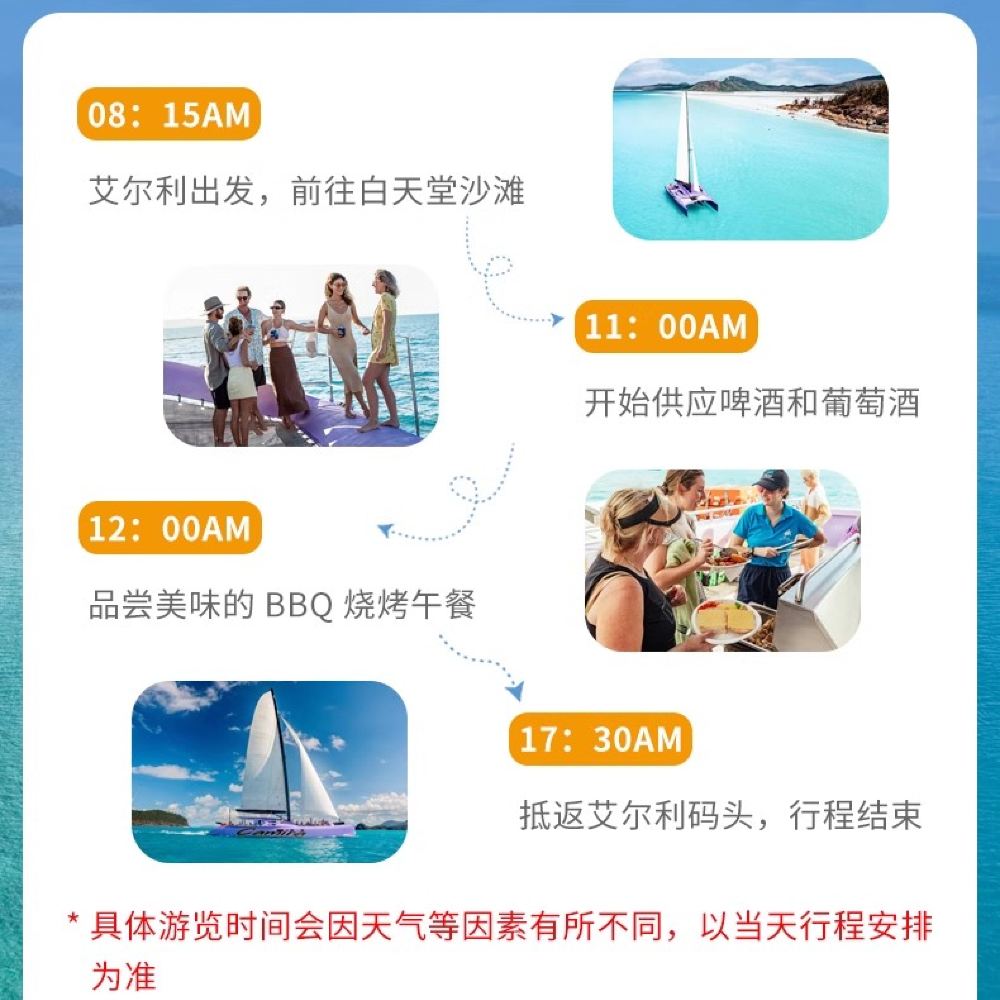 Please note: If the Camilla is affected by tides on the day, the boat may run aground due to its large size, and the itinerary may not be able to proceed to Hill Inlet Lookout. If it's not possible to go to Hill Inlet Lookout, the captain will take everyone to the southern end of Whitehaven Beach for sightseeing and activities. No refunds will be provided in this situation. Thank you for your understanding!