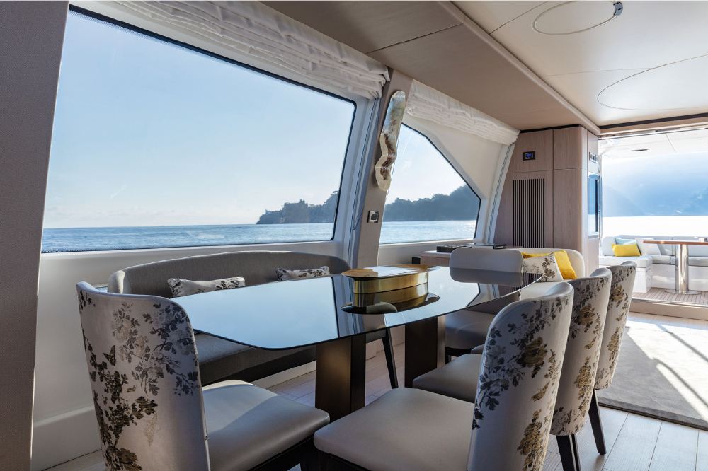 Three-tier flybridge for sunbathing, equipped with a refrigerator and oven