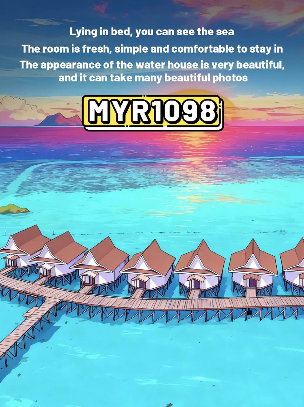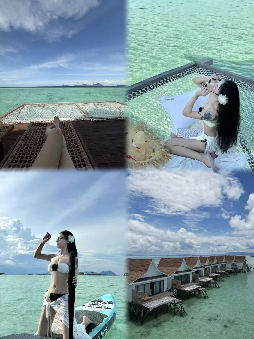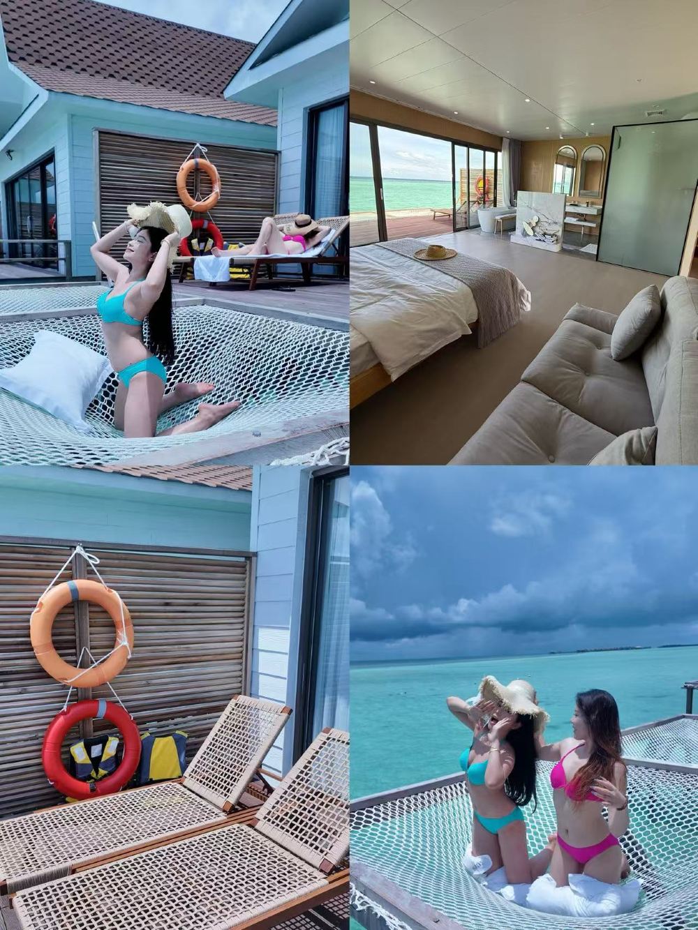 Spacious water bungalows with large terraces, net beds & sun loungers.