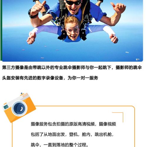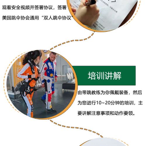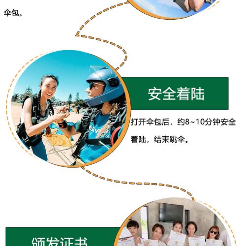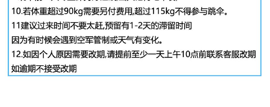 6. It is recommended not to consume excessive alcohol the night before skydiving and avoid eating too much before the activity. Skydiving is not allowed within 24 hours after diving. Pregnant women, individuals with a history of heart or brain diseases, severe hypertension, or other special conditions cannot participate in skydiving activities. If feeling unwell during the activity, please inform the instructor immediately.