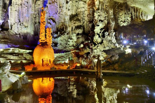 ▲ Zhijindong Cave Located in Zhijin County, Bijie City, Guizhou Province, Zhijindong Cave is one of China's renowned karst caves, celebrated for its grand scale and unique formations. The cave is adorned with stalactites, stalagmites, stone curtains, and flowstones—calcium carbonate deposits that create a dreamlike spectrum of colors and layers under the illumination of lights. Its geological structure documents millions of years of crustal movements and hydrological changes, offering immense scientific research and aesthetic value. Visitors walking through the cave can marvel at nature's extraordinary craftsmanship while immersing themselves in the serene and mysterious ambiance of the underground world.