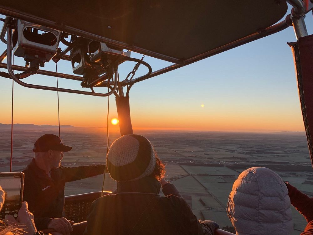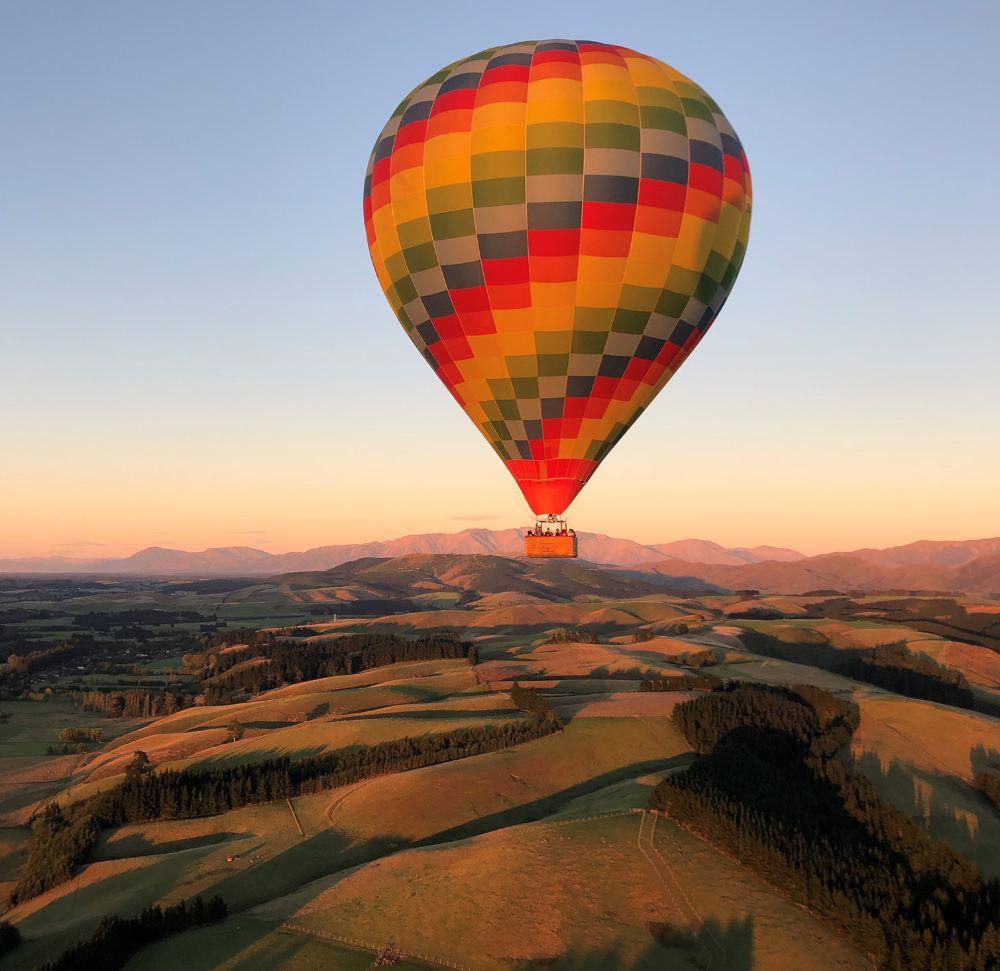 Soaring gently at dawn, enjoy a bird's-eye view of Canterbury Plains' pastoral scenery and the majestic Southern Alps, experiencing nature's tranquil yet awe-inspiring wonders.