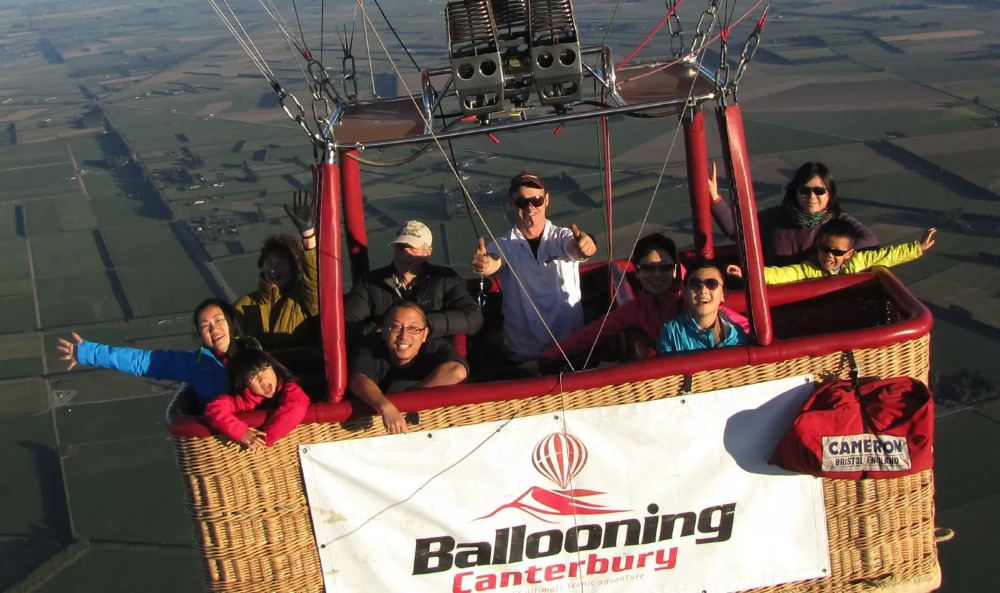The hot air balloon ride lasts approximately 45–60 minutes, offering an aerial view of the Canterbury Plains and the Southern Alps.