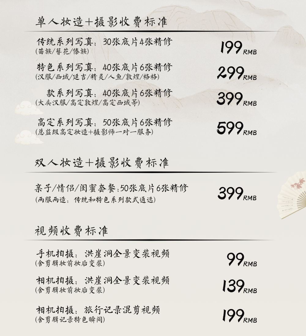 Special Series (Hanfu/Western Regions/Yanji/Fairy/Mermaid/Dunhuang/Princess): CNY 299 per person (Note: The group photos shown also cost CNY 299 per person) 40 original photos + 6 retouched photos