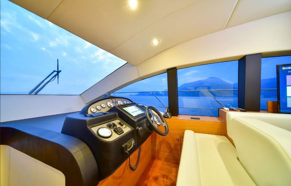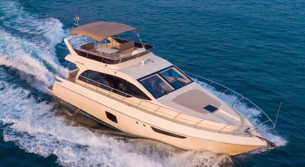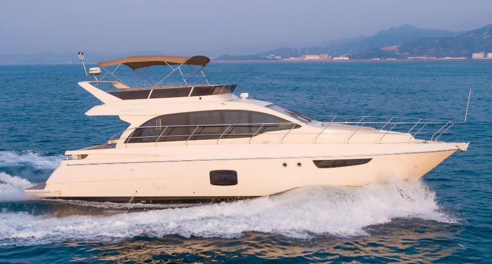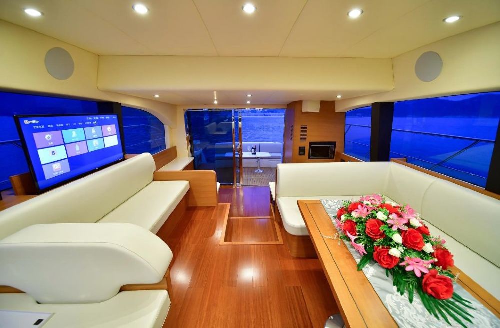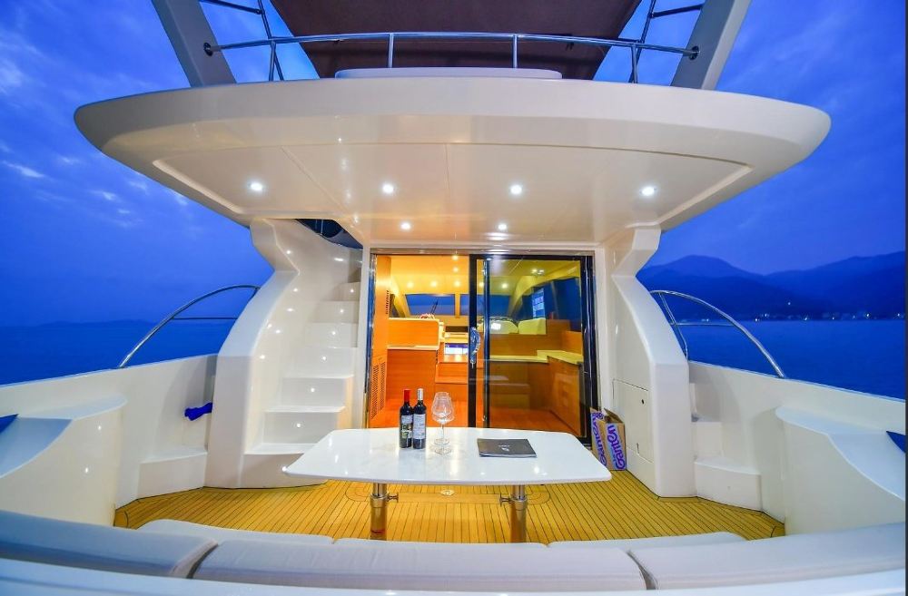 52-foot luxury yacht with three decks, featuring a flybridge, observation deck, bedroom, bathroom, and yacht KTV