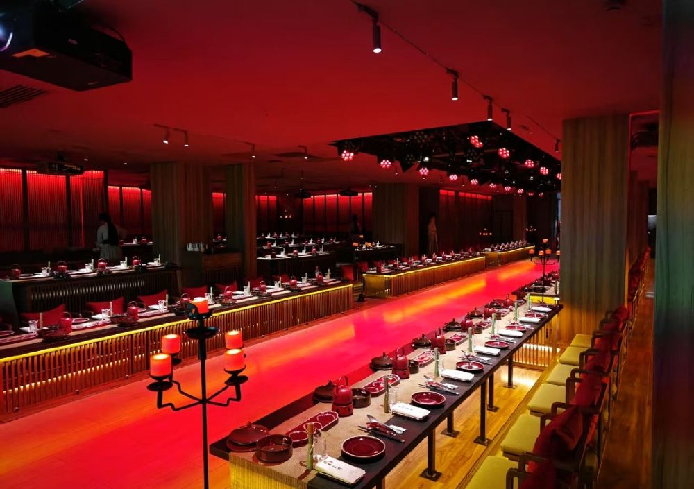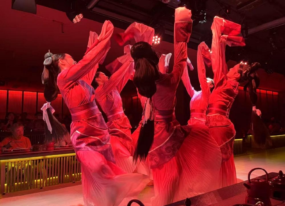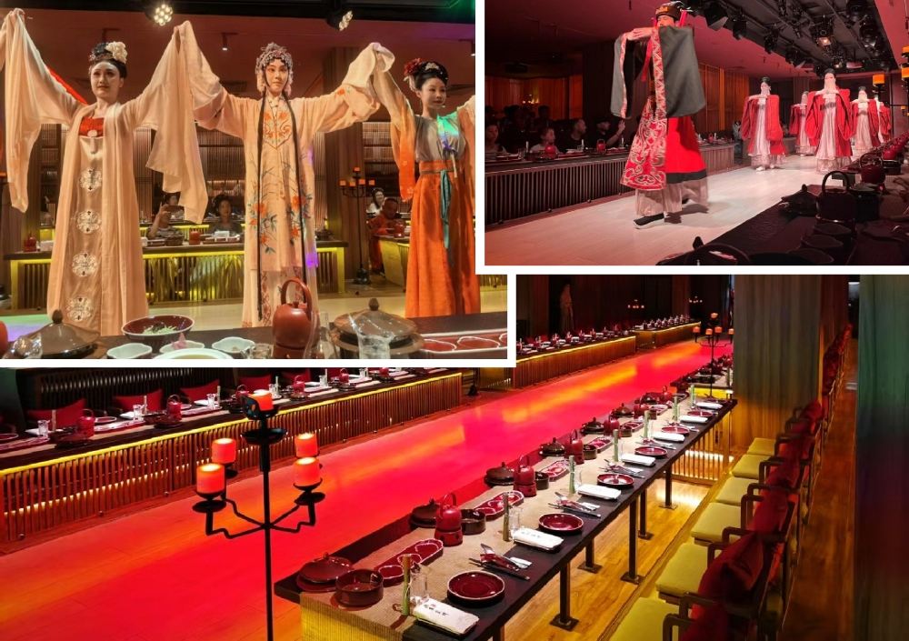 The restaurant features a dominant red color scheme that creates a luxurious palace-like atmosphere, with lighting transitions later in the evening adding a distinctive vibe. Its interior combines stately elegance with modern elements, preserving royal solemnity while maintaining contemporary style. A T-shaped stage in the main hall allows guests to enjoy performances up close, while private dining rooms cater to various privacy needs. From the moment you step inside, you'll feel transported back to an ancient imperial court.
