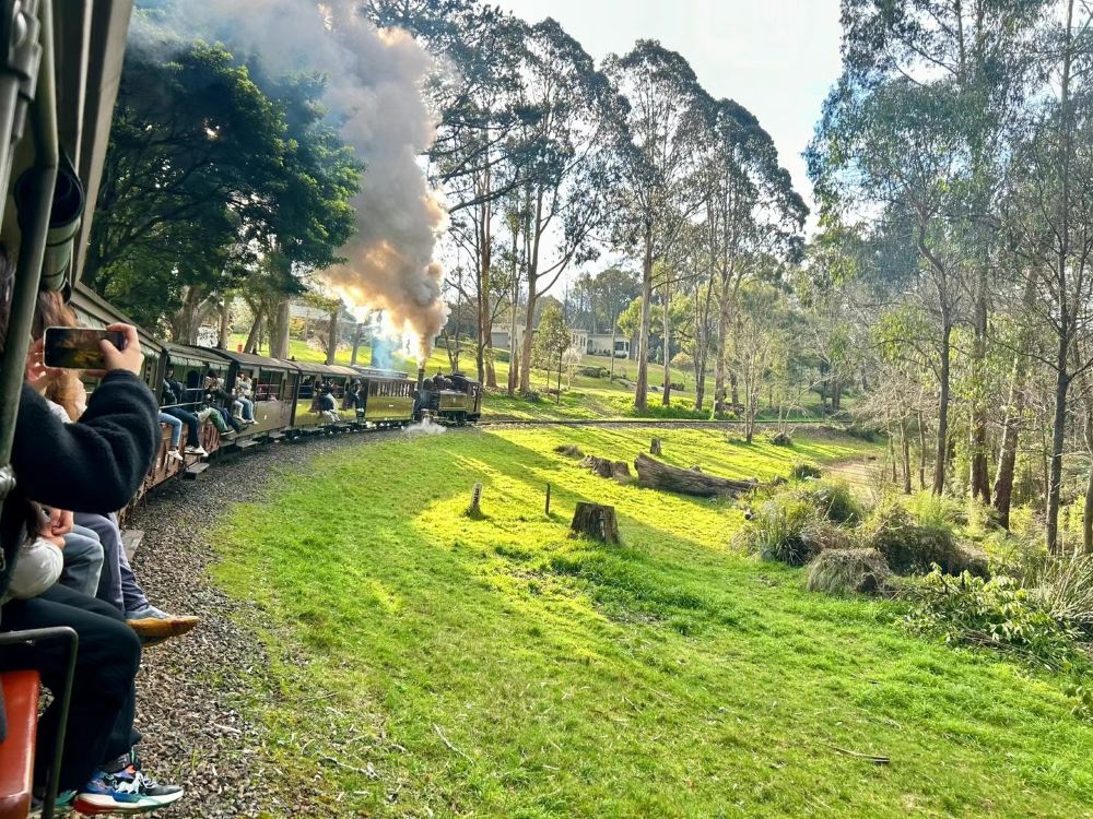 ▲ The Puffing Billy Steam Train offers a unique experience where you can sit on the open carriage windowsills with your feet dangling outside, leisurely traveling through the lush forests of Dandenong Ranges, fern-filled gullies, and farmlands. This distinctive riding style has become rare to find elsewhere in the world. During the journey, you'll pass iconic wooden trestle bridges where the panoramic views are spectacular when the train makes turns—perfect photo opportunities. The train's billowing white steam drifts through the trees, complementing the blue skies and clouds, creating a nostalgic time-travel atmosphere. Along the way, local residents, workers, and even passersby often wave warmly to travelers on the train, adding a heartwarming interactive element to the experience.