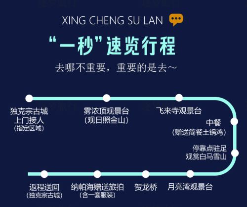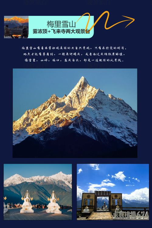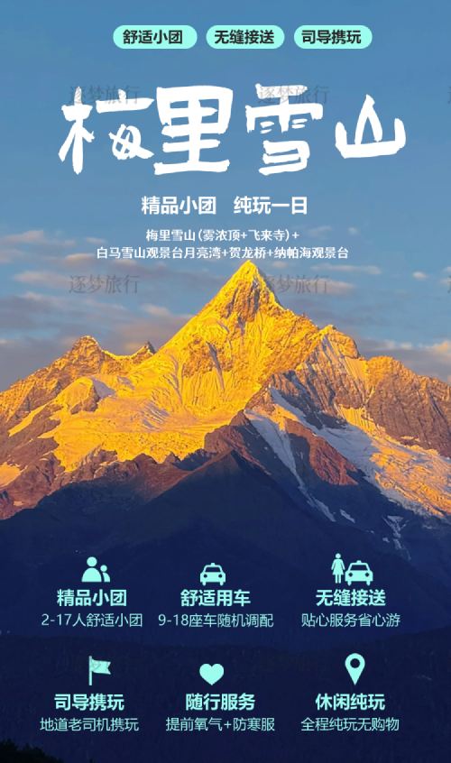 1-day tour of Meili Snow Mountain National Park: Golden Sunrise at Meili Snow Mountain + Feilai Temple Viewing Platform + Wunongding Viewing Platform + Baima Sonw Mountain Viewing Platform + Moon Bay Viewing Platform + He Long Bridge + Napahai Viewing Platform, featuring six major scenic spots